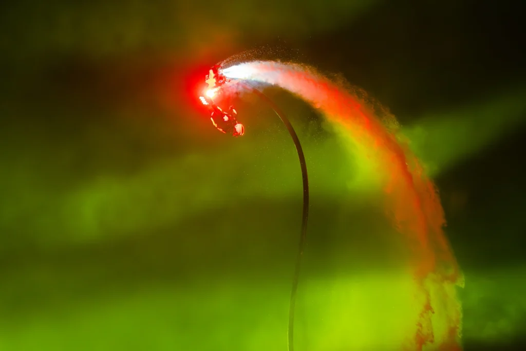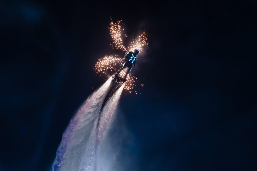 Backflip na flyboardzie polega na pełnym obrocie w tył nad wodą, wykonywanym dzięki sile strumieni wody wyrzucających zawodnika w górę. Wykonanie jednego takiego ewolucyjnego skoku wymaga precyzyjnej koordynacji, kontroli środka ciężkości i natychmiastowego wyczucia wysokości – przy 43 powtórzeniach w ciągu minuty margines błędu praktycznie nie istnieje. Dodatkowym utrudnieniem jest fakt, że każda niedokładnie „wypłaszczona” rotacja może skończyć się twardym lądowaniem na wodzie, utratą rytmu, czyli całkowitym zakończeniem próby.
