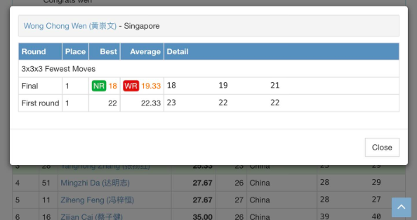Średnia w konkurencji FMC jest wyliczana z trzech ułożeń. Rezultaty Wonga z tego dnia to: 18 ruchów w pierwszej próbie, 19 w drugiej i 21 w trzeciej. Wyniki na poziomie 18 i 19 ruchów wprawiły społeczność speedcuberską w osłupienie.